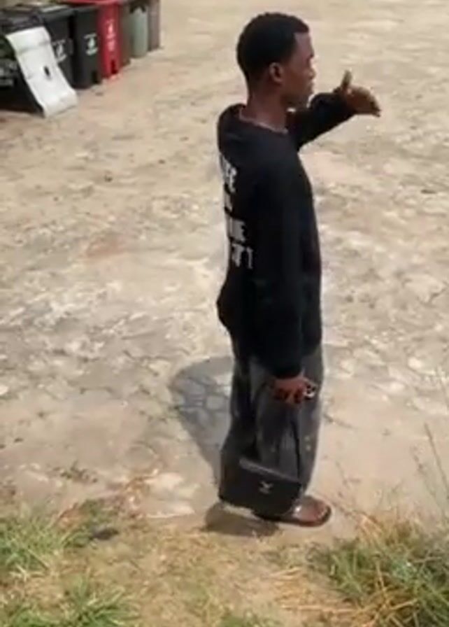 young man standing on cracked pavement, looking into the distance. He is wearing a black long-sleeve shirt with writing on the back, gray pants, and sandals. He is also carrying a small black handbag. He puts his hand up to his forehead as if to shield his eyes from the sun, and then raises his arm to point something out. In the background, there are trash cans, a building, and two other people standing near the building. There is also a motorcycle in the distance. The surrounding area appears to be outdoors, with some greenery visible.