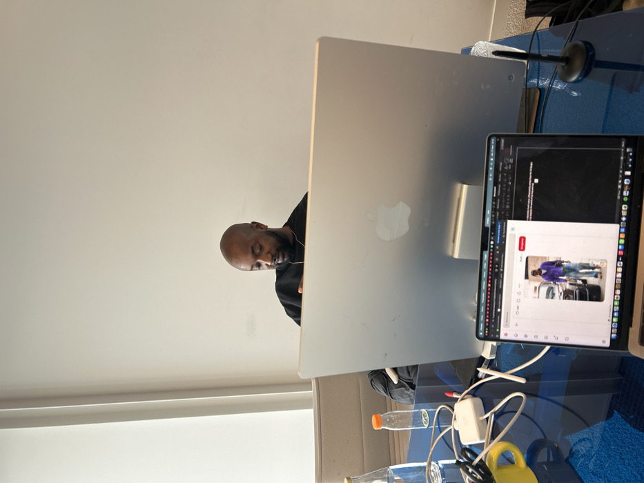 The scene takes place in Montreuil, France, within an interior workspace. A bald adult male with dark skin and a beard, wearing a black long-sleeved shirt and a thin necklace, is seated behind a large silver Apple iMac monitor. He is positioned facing forward but looking downward, appearing focused on an unseen item directly in front of him, likely a keyboard or the laptop in the foreground. In the immediate foreground, a silver MacBook Pro laptop rests on a blue-patterned desk surface. The laptop screen displays a web browser window open to a webpage featuring a vertical image of a man in a purple jacket standing next to a black car. Another browser tab to the right shows text content. To the left of the laptop, on the desk, are several objects: a glass bottle of water, a smaller clear plastic bottle with an orange cap, a white power adapter with multiple cables, and a yellow mug containing pens or pencils. To the right of the laptop, a black stylus or digital pen stand is visible. The background features a plain white wall, with a grey upholstered furniture piece (possibly a chair or sofa) visible to the left of the man. Vertical window blinds or paneling are present on the far left.
