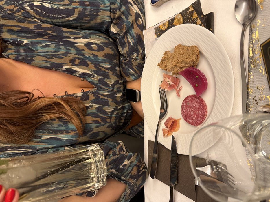 The image showcases a woman at a dinner table. She wears a patterned dress and a watch on her wrist. A plate of food rests beside her, containing bread, ham, beetroot, and salami. Silverware is arranged beside the plate. A large glass sits near her hand, with red nail polish visible on her fingers. The table is covered with a white tablecloth adorned with gold accents.
