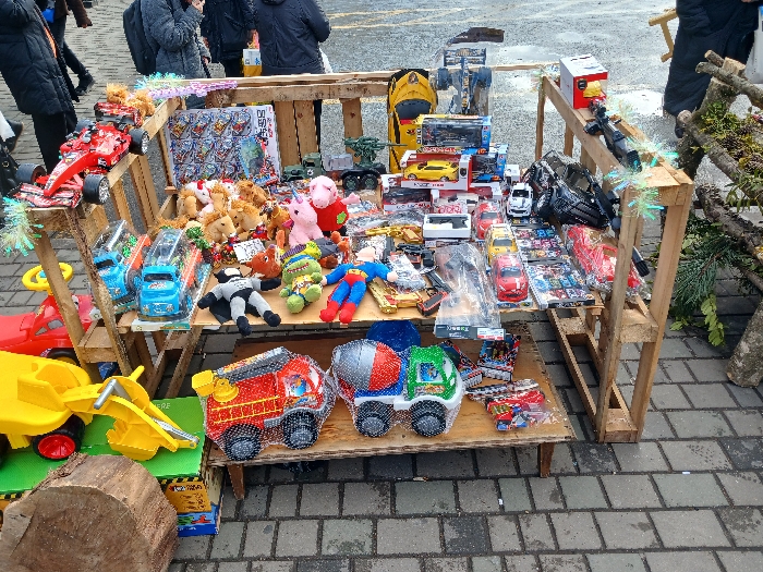 The image depicts an outdoor market stall in Tbilisi, Georgia, constructed from raw wooden pallets and planks. The two-tiered stall is laden with toys. The upper tier features a large red Formula 1 racing car, several packaged blue toy trucks, a collection of plush toys (including a pink pig, unicorn, horses, Superman, Batman, and a green character), various model cars (yellow and red sports cars), and toy firearms. A yellow backpack and other packaged items, some with foreign language text, are also visible on this tier. The lower tier holds a large yellow toy construction vehicle, a red ride-on toy, and two prominent toy trucks (a red fire truck and a multi-colored cement mixer) encased in mesh packaging, alongside other smaller packaged toys. Decorative tinsel in blue, green, and pink adorns the upper wooden framework. The ground is paved with rectangular grey and brown bricks. In the blurred background, multiple individuals, dressed in dark winter clothing, are seen walking. A stack of branches and cut wood is positioned to the right of the stall.