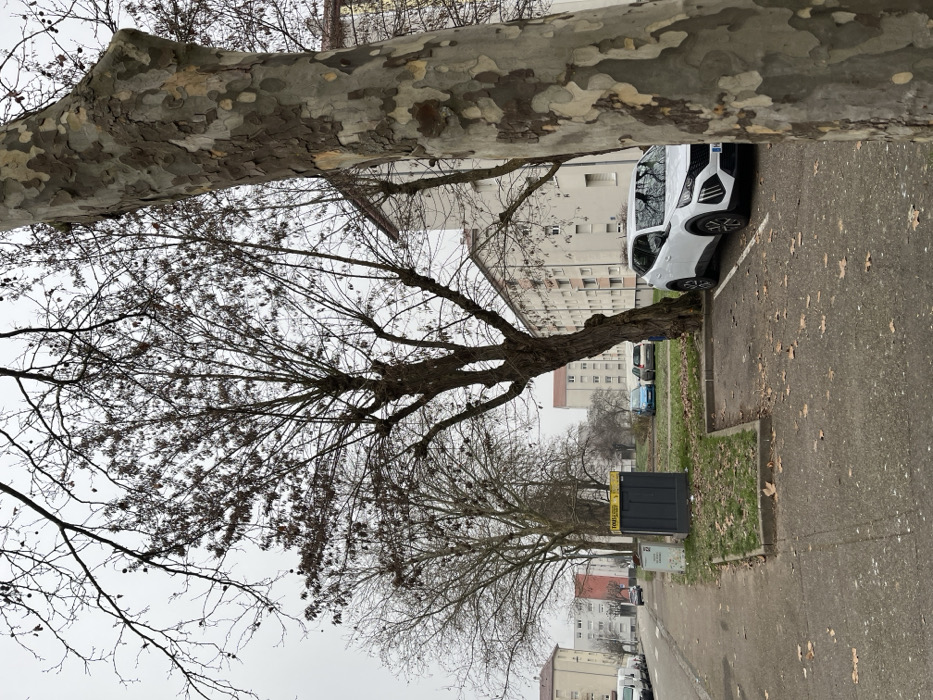 The image depicts an urban residential street in Strasbourg, France, on an overcast day, indicative of late autumn or winter. In the immediate foreground on the right, a large tree trunk with mottled, peeling bark (a plane tree) partially obscures the view. To its left, a white SUV, identified as a Peugeot 2008, is parked facing left in an asphalt parking space. Adjacent to this parking area is a patch of sparse grass scattered with brown leaves. Two utility boxes stand on the edge of this grassy area; the larger, dark grey box features a yellow sign displaying "TAXIS STRASBOURG" in black lettering. Further left, an asphalt road extends into the distance, lined by multiple parked vehicles, including several white vans. A dark-colored car is observed moving away in the far distance. Multi-story apartment buildings, predominantly light beige with some reddish-brown sections, line both sides of the street and fill the background. Numerous deciduous trees with bare branches or sparse brown leaves are visible throughout the scene, bordering the street and situated within green spaces between buildings. No individuals are visible in the scene.