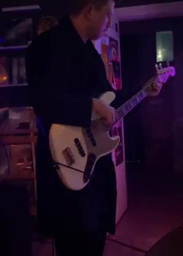 A man is playing a white electric bass guitar in a dimly lit room with purple accents. He is wearing a black coat and appears to be focusing on his playing. The room contains a record collection, posters, and a doorway leading to another room. The lighting creates shadows, making the details somewhat obscured.