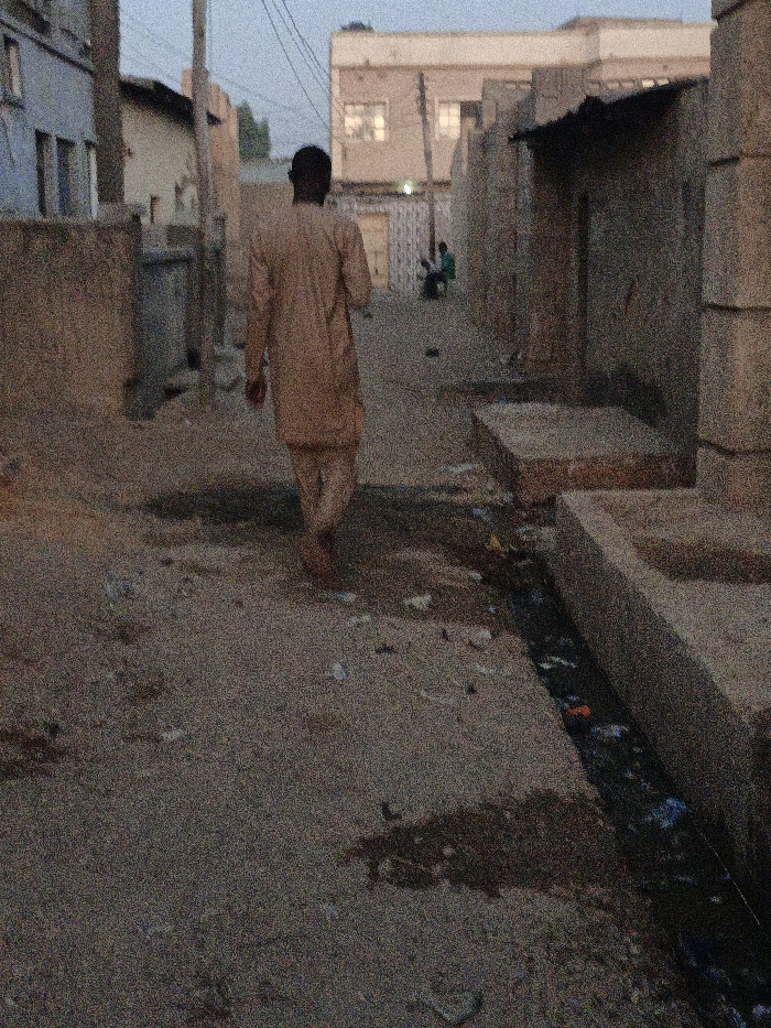 The image depicts a narrow, unpaved street or alleyway in Kaura Goje, Nigeria, under diffused lighting conditions suggesting dusk or dawn. In the immediate midground, a lone individual, viewed from behind, walks away from the camera. This person wears a light-tan, long-sleeved tunic and matching trousers, and appears to be barefoot. The street surface is composed of packed dirt or gravel, showing scattered debris. To the right of the walking individual, an open drainage channel runs parallel to the street, containing dark liquid and visible refuse, including plastic bags. Adjacent to the channel, a rectangular, flat concrete or stone slab lies on the ground. Various single-story structures, constructed from light-colored, possibly stuccoed or mud-plastered materials, line both sides of the street. Some buildings exhibit visible windows. Utility poles with overhead wires are present on the left side of the street. In the distant background, at the end of the visible street, two indistinct figures are seated or crouched near a building on the right side; one appears to wear a green garment. Beyond these, a larger, multi-story building with multiple windows and a flat roof is visible. The sky above is light and hazy.