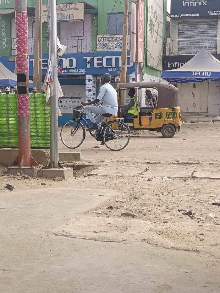 The image depicts an urban street scene in Fagge A, Nigeria, during daylight. In the foreground, a multi-sectioned pole, featuring a rusted orange base and a grey upper section adorned with red and white patterned fabric and white papers, stands on a concrete foundation. To the pole's left, a tall stack of green packages, possibly "oraimo" branded, is visible. The immediate ground is composed of cracked concrete and dry, light-brown soil with scattered debris and small rocks. In the midground, a dark blue bicycle with a black seat and fenders is in motion, ridden by a man dressed in a light-blue long-sleeved shirt and trousers, wearing a cap. He is pedaling from left to right across the frame. Behind him and slightly to the right, a yellow motorized tricycle (keke napep) with a brown canvas canopy is also moving from left to right. The driver, visible in the front left of the tricycle, wears a green reflective safety vest. A passenger sits behind the driver, wearing a striped shirt. The tricycle displays a license plate "NSR 6590" on its rear. The background features several commercial buildings. A prominent blue facade displays "TECNO TECNO" in large white lettering, with smaller text "MUNSA GLOBAL VENTURES" and "City Mobile Comm." below. Above this, a green building shows signs including "M.A.B & SONS" and "TEXTILE & GENERAL VENTURES LTD". To the right, another building features "INFINIX" and "RADEX COMMUNICATIONS" signage. A white tent, branded "TECNO", is set up in front of one of the buildings. The sky is not visible.