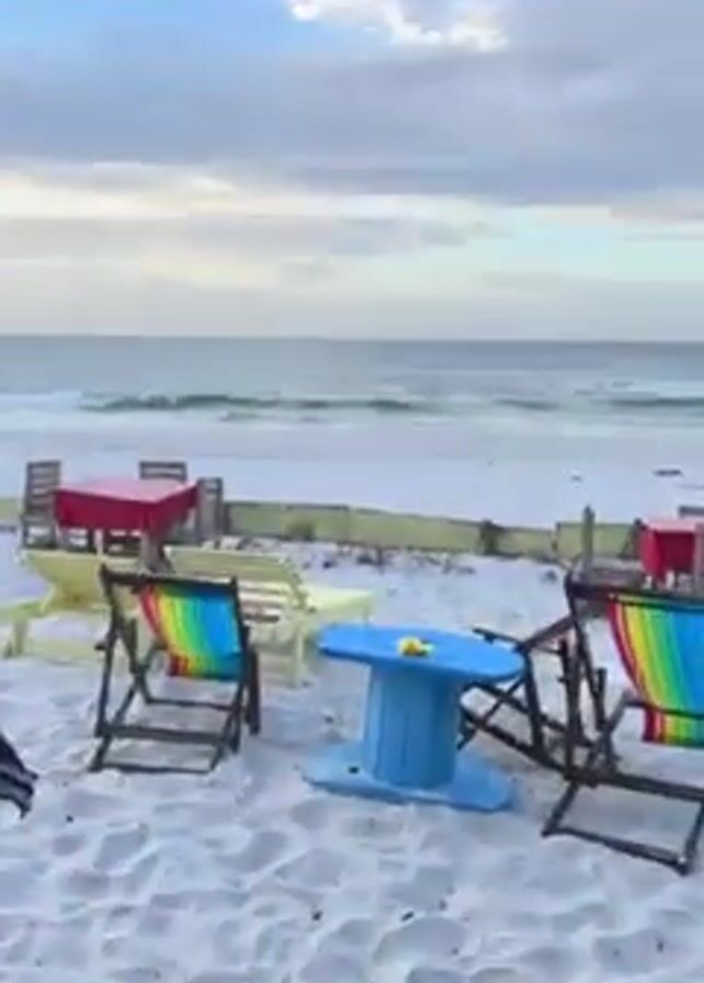 beach scene with a boardwalk in the foreground leading onto white sand. There are scattered chairs and tables, some with colorful designs and a few with red tablecloths, set up on the beach. The ocean is visible in the background, with waves coming ashore. The sky is partly cloudy with patches of blue visible. In the distance, a mountain range can be seen under a muted, soft light.