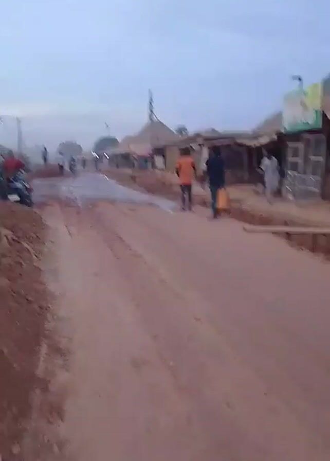 dusty, unpaved road in a village. Several people are walking along the road, and motorbikes are parked on the side. Some buildings line the road, appearing to be small shops or stalls. The sky is overcast, suggesting it is early morning or late afternoon. The overall scene is of a simple, rural setting with signs of human activity.