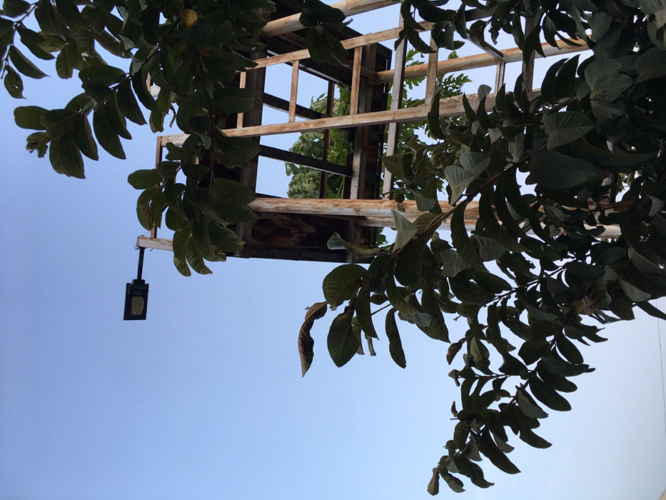 A low-angle shot captures a wooden structure intertwined with foliage against a clear, blue sky