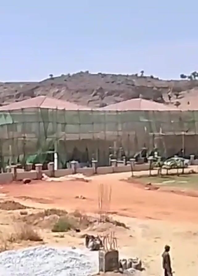 construction site with multiple buildings under construction. The buildings have red roofs and are partially covered with green netting. A concrete fence surrounds the property. There is a dirt road in front of the buildings. In the foreground, there are construction materials and a concrete pump. Two people are working in the foreground. In the background, there is a grassy area and a hill. The sky is clear and blue.