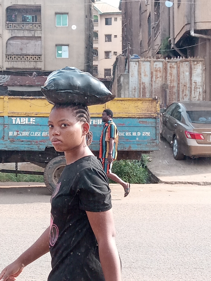 The image portrays an urban street scene in Unknown, Unknown, under daylight conditions. In the immediate foreground, a young Black female, appearing in her late teens or early twenties, walks on a paved asphalt road. She has dark skin, braided hair, and wears a black short-sleeved t-shirt with light-colored splatters. She carries a large, dark, irregularly shaped bundle balanced on her head and looks directly at the viewer with a neutral expression. Behind her, in the mid-ground, a Black adult male walks from right to left on a dirt verge adjacent to the road. He wears a vertically striped, multi-colored short-sleeved shirt (featuring orange, blue, green, yellow, and black stripes), dark shorts, and dark flip-flops. A light blue flatbed truck with a yellow cabin is partially visible in the middle ground, behind the female. Its side bears white text, including "TABLE" and "FDAC REG. NO. 01-12792." To the right of the truck, a light brown sedan is partially visible, parked on an elevated dirt area. The background features several multi-story concrete buildings in various conditions, some appearing worn or dilapidated, along with a rusted metal gate. Sparse green vegetation grows on the dirt verge.