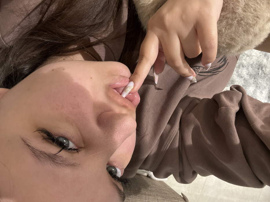 A close-up, top-down view depicts a female individual in an indoor setting within Kiryat Motzkin, Israel. The subject, who has fair skin, dark hair, and prominent dark eyelashes, looks directly towards the camera. Her head is slightly tilted. Her right index finger is positioned on her lower lip, which appears glossy. Her fingernails are long, almond-shaped, and decorated with a light base and intricate white and gold abstract designs. She wears a brown garment, possibly a hoodie or sweatshirt, and a thin gold-colored necklace is visible. The background includes a light-colored, textured surface, possibly a rug, and a solid light-colored surface, likely a floor. A beige upholstered object is partially visible on the far left.