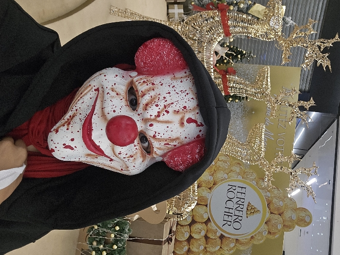 A creepy clown mask with a white base, red nose, red spots, and red patches on the head, sits inside a black hooded robe. The mask's eyes are visible. In the background is a Christmas display featuring golden reindeer, Christmas decorations, and a large "Ferrero Rocher" advertisement composed of the chocolates. The scene gives an unsettling contrast between festive holiday decor and a sinister clown figure.