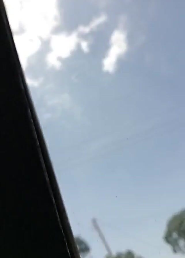 view of the sky through what appears to be a car window. The sky is blue with scattered white clouds. There are power lines visible in the distance. A woven plastic bag, partially visible, is near the top left corner. Part of a car's interior, including a sun visor, is also visible. The perspective suggests the video was taken from inside a vehicle. There is brief audio containing speech, in an unidentified language.