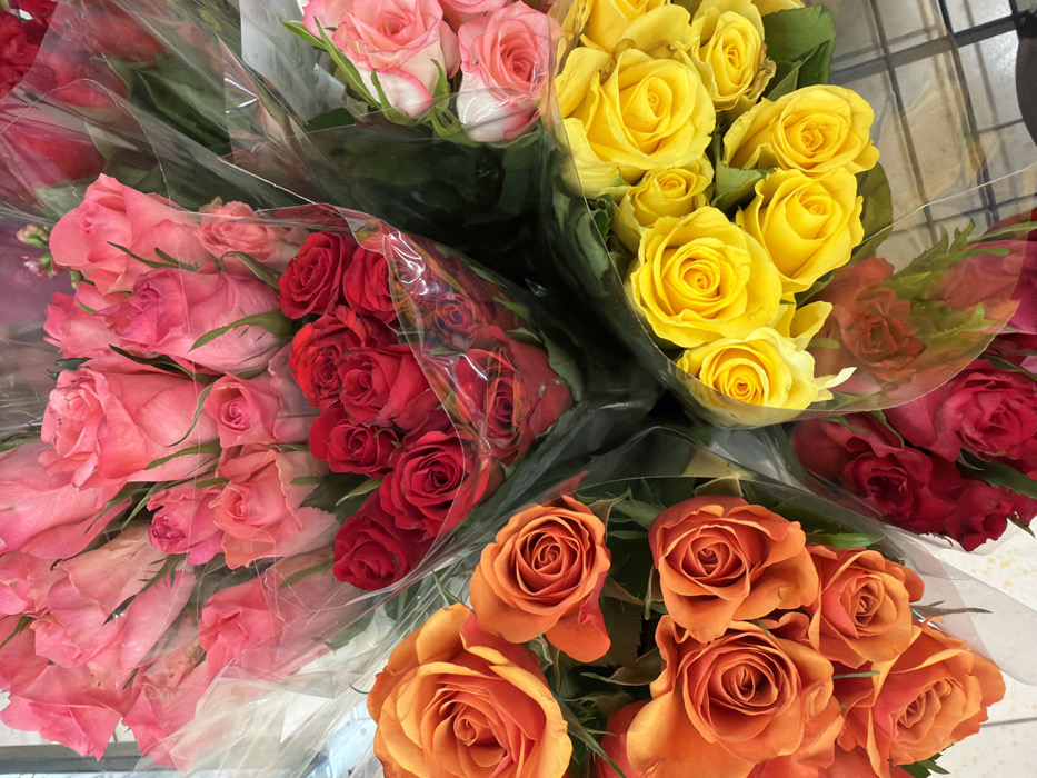 - "This image presents an overhead, close-up view of several bouquets of cut roses, likely displayed for sale in a retail setting in Vratsa, Bulgaria" by FM-cheYL2, licensed under CC BY 4.0