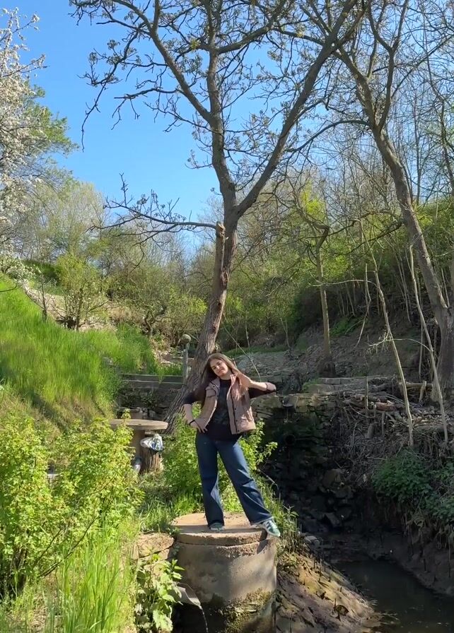 A woman stands on a concrete structure over a small stream. She has long brown hair and is wearing a brown vest, a dark long-sleeved shirt, and jeans. She poses with her hands on her hips, then moves her arms out to the sides. The stream flows under a stone structure with a pipe. The area is surrounded by green vegetation and trees under a blue sky.