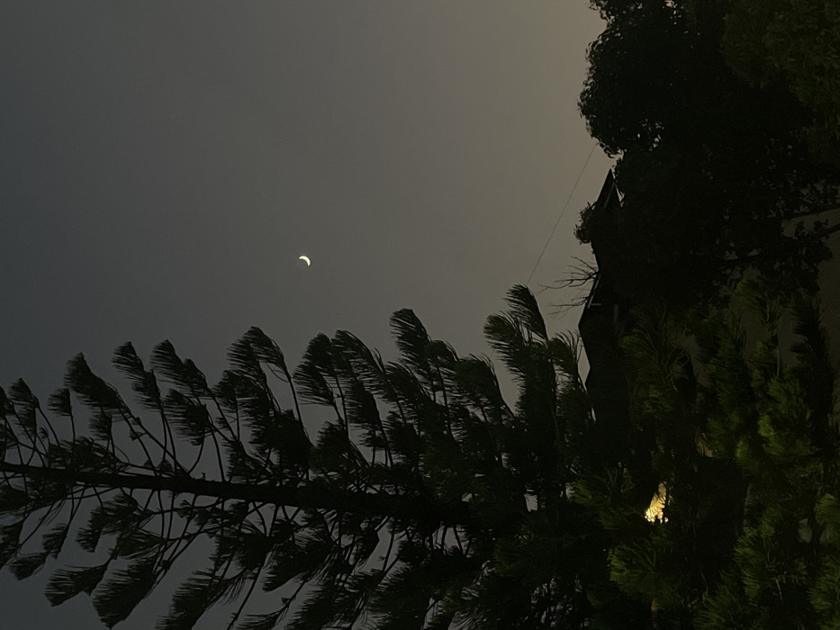This image depicts a nocturnal or late twilight scene in Coatzacoalcos, Mexico. The upper two-thirds of the frame are dominated by a dark grey sky, against which a distinct, slender white crescent moon is visible in the upper right quadrant. No other celestial bodies are discernible. A large, tall conifer tree, likely a Norfolk Island Pine, occupies the left side of the frame, extending from the bottom edge upwards. Its trunk is dark, and its dense, horizontal branches with needle-like foliage appear as dark silhouettes, with subtle hints of deep green in the lower sections. A small, bright yellow light source is partially obscured by the tree's foliage in the lower-left-mid section. In the mid-ground, beneath the moon and to the right of the prominent tree, the dark silhouettes of residential rooftops are visible against the ambient light of the sky. These structures are consistent with urban or suburban housing. Further to the right and lower, additional dark silhouettes of trees or dense vegetation are present. No individuals, overt actions, or interactions are visible within the frame.