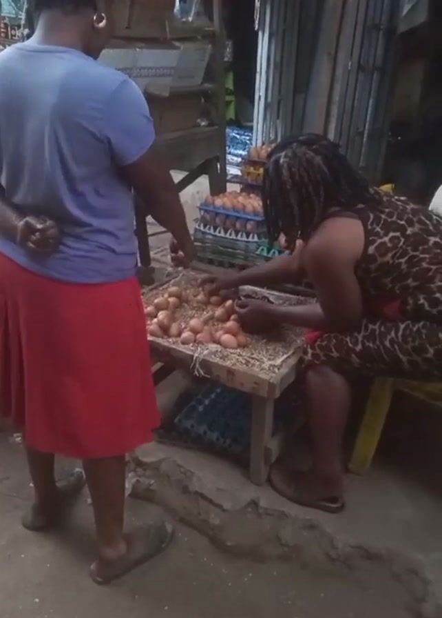 A woman in a blue t-shirt and red skirt stands with her hands clasped behind her back, observing another woman. The seated woman is wearing a leopard-print dress and has her hair in braids. She is carefully examining a pile of brown eggs on a small wooden table. Crates of eggs are visible in the background. A man walks past the camera. The scene appears to be taking place outdoors, likely in a market setting.