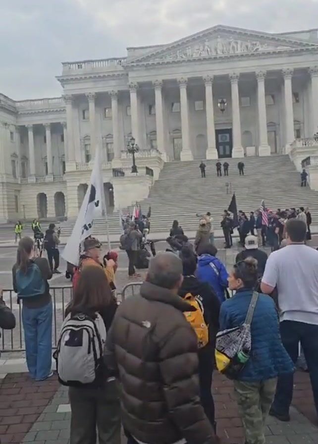 crowd of people gathered in front of a large white building with columns, likely the U.S. Capitol Building. The crowd appears to be separated from the building by a barricade. Some people are holding flags, including what appears to be a "Veterans for America" flag. Many individuals are taking photos or recording videos. The overall scene suggests a protest or demonstration. The weather seems overcast and the sky is grey. Police are visible on the upper steps of the building.