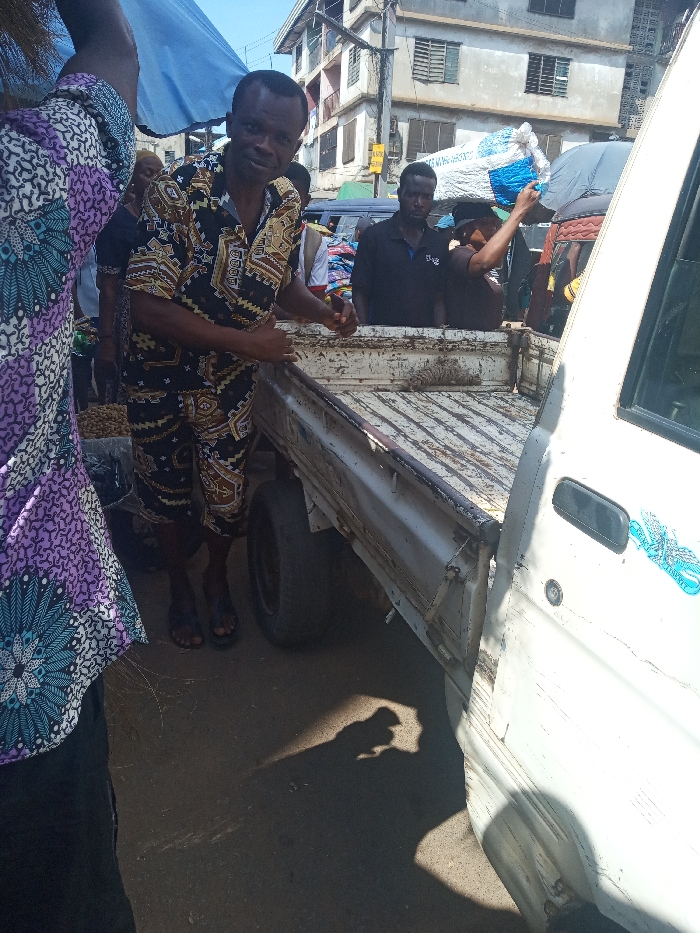 The image depicts an outdoor, daytime market scene in Nkwelle, Nigeria. In the foreground, partially visible on the left, is the shoulder and upper back of a person wearing a purple, blue, and white patterned shirt. At the center, a dark-skinned male adult, wearing a black, gold, and white patterned short-sleeved shirt and matching knee-length shorts, is leaning on the elevated side of a white, weathered pickup truck bed. He looks directly at the camera with a slight smile. His hands are near the truck bed's edge. He wears dark sandals. Inside the truck bed, another dark-skinned male adult, wearing a dark polo shirt, is visible from the chest up, positioned further back and looking forward. Directly behind the truck bed, a person (gender indeterminate), also visible from the chest up, is balancing a large, white sack with blue markings on their head, appearing to carry it. The white pickup truck, which occupies a significant portion of the midground and right, exhibits wear, scratches, and rust on its body, particularly the flatbed and driver's side door panel. A faded light blue decal is present on the passenger side door. In the truck bed, near the central figure, a small, light-colored object resembling a dried rodent or small animal carcass lies on the metal surface. To the left of the truck, partially obscured by the foreground figure, small, rounded objects, possibly nuts or seeds, are visible on the ground or a low platform. The background features a multi-story concrete building, at least two stories high, with multiple windows, some fitted with security bars. Utility poles and overhead wires are also visible. A large blue canopy or tarp is present in the upper left background, suggesting a market stall. The ground appears to be a dirt or uneven asphalt surface. Strong sunlight casts distinct shadows, including a profile shadow of a person wearing a hat, visible on the ground in the lower right foreground. The overall scene suggests a busy commercial street or market environment.