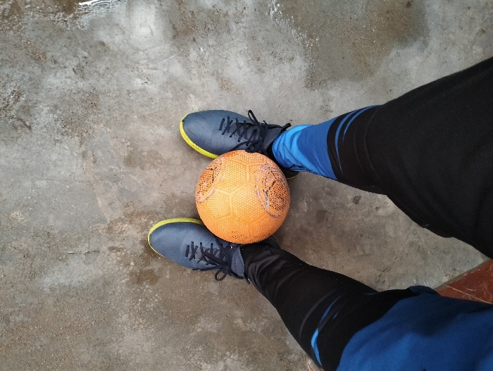 - "From a top-down perspective, a person's legs are visible wearing black and blue soccer pants and blue soccer shoes with a yellow stripe" by FM-PJNzU2, licensed under CC BY 4.0