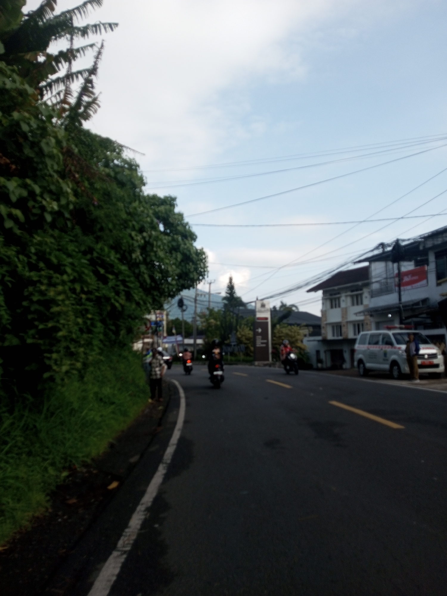 The image depicts a street scene in Mya Sit Kaing Ywar Thit, Myanmar. The road is paved and marked with a white line along the left edge and broken yellow lines in the center. Several motorcycles are visible on the road, traveling in both directions. A white van is parked on the right side of the road near a building displaying a red and white "J&T" sign. A person stands beside the van. The left side of the road is lined with dense vegetation, including grass and overgrown shrubs. Overhead, power lines stretch across the sky, which is partly cloudy. In the distance, buildings and trees can be seen. A sign is visible to the right of the van.