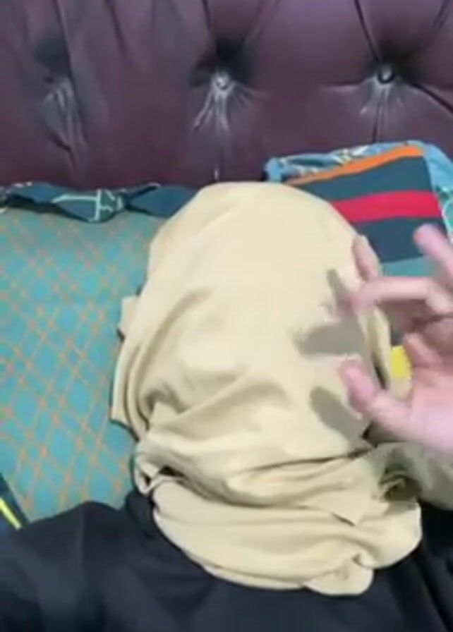 A person lies on a bed with their head covered in a light-tan colored garment, presumably cloth