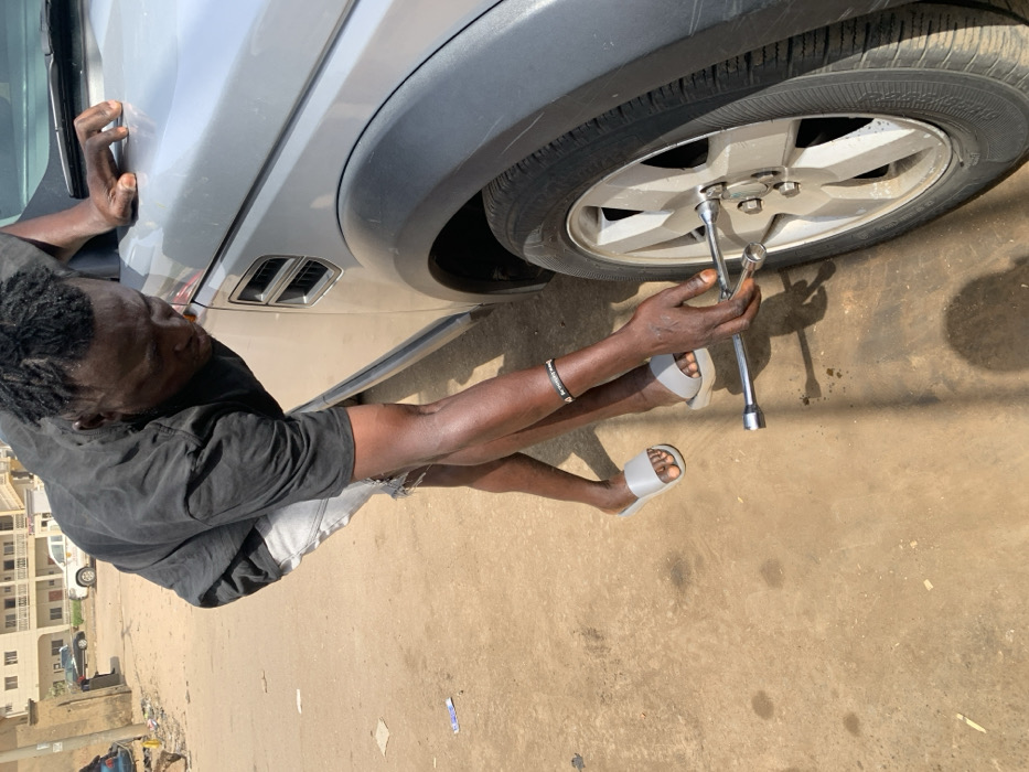 A dark-complexioned adult male, with short dreadlocks, is depicted actively working on the front passenger wheel of a silver SUV, consistent with a Land Rover Discovery model based on fender vent design