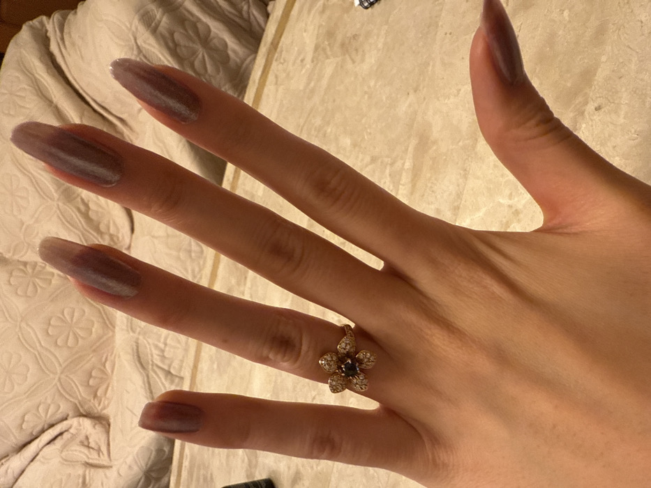 A dorsal view of a light-skinned left human hand is depicted, with fingers slightly spread and resting on a light-colored, veined surface within the City of Kawasaki, Japan. The fingernails, including the thumb, index, middle, ring, and pinky, are long and almond-shaped, with the pinky nail appearing shorter than the others. All visible nails are coated with a translucent, shimmering purplish-gray polish. A yellow-gold toned ring, fashioned as a flower with a central dark gemstone surrounded by smaller clear stones, is worn on the ring finger. In the blurred background, a light-colored textile item with a subtle patterned design, consistent with upholstered furniture or bedding, is visible. A dark, partially visible cylindrical object is located on the surface to the left of the pinky finger.