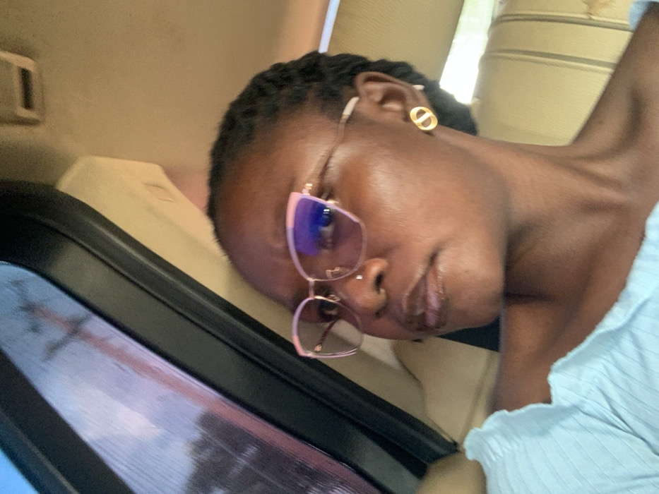 A woman rests her head against a car seat while wearing pink-rimmed glasses and a gold "CD" earring. She has dark skin and braided hair. She's wearing a light blue shirt. The car window shows blurry reflections, suggesting movement. The overall scene conveys relaxation or travel.