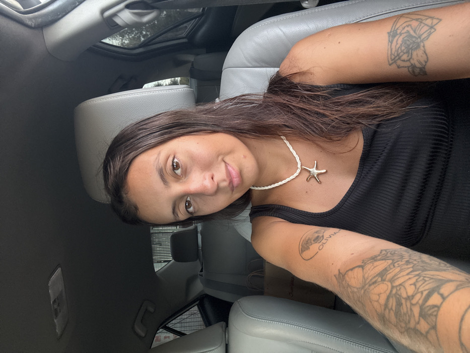 A young woman sits in a car, wearing a black tank top and a white braided necklace with a starfish pendant. She has brown hair and eyes, and is smiling slightly. The woman has tattoos on her arms, including one with the name "Olivia." The car has gray leather seats and a sunroof. The picture is taken from a low angle, looking up at the woman.