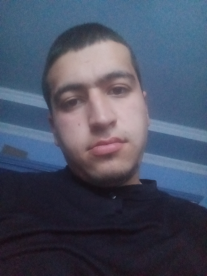 A close-up, frontal image depicts a single male individual. The subject has short, dark hair, brown eyes, and a neutral facial expression, with a visible small dark mark or mole on the left cheek (viewer's left). He is wearing a dark, collared shirt with two visible buttons at the neckline. The background is out-of-focus, primarily blue, with faint horizontal lighter-colored banding or architectural details suggesting an indoor environment. The subject directly faces the camera. The depicted scene is located in Kasan, Uzbekistan.