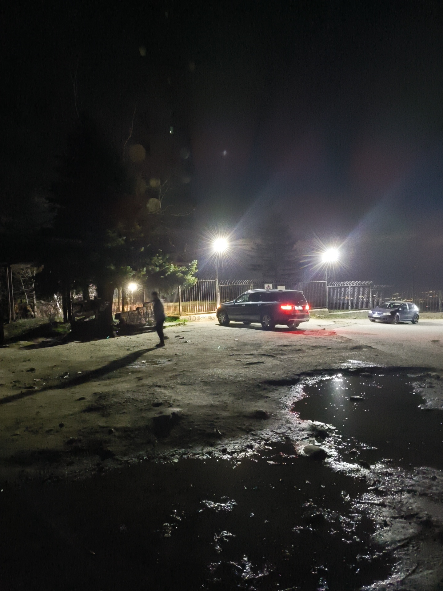A nighttime scene in Sofia, Bulgaria. The foreground shows a rough, muddy area with puddles reflecting the streetlights. A person is standing near a tree in the middle ground, with two cars visible further back, parked along the street. The setting is urban, illuminated by streetlights, and is likely an industrial or residential zone.