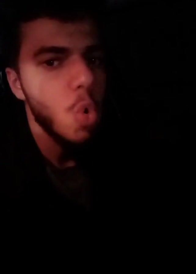 A young man with dark hair and a trimmed beard is visible from the chest up, inside a car at night