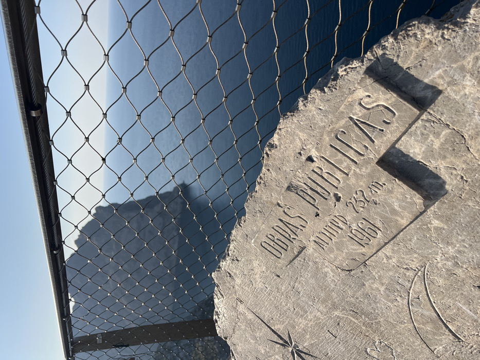 The image presents a sunlit clifftop viewpoint overlooking the sea, likely situated at Cap de Formentor in Pollença, Spain. In the foreground, a light-colored, weathered stone surface features an embedded rectangular plaque. The plaque bears the carved inscriptions "OBRAS PÚBLICAS," "ALTITUD 232 m.," and "1961." To the left of the plaque, a compass rose-like star and a crescent moon are carved into the surrounding stone. A sturdy metal mesh safety railing, comprising interconnected wires forming a diamond pattern, extends horizontally across the midground, partially obscuring the view. Beyond the railing, the deep blue sea extends to a clear horizon under a pale blue sky. On the left, a dark, rocky landmass or sea cliff rises from the water, visible through the mesh. The scene is devoid of people or discernible activity.