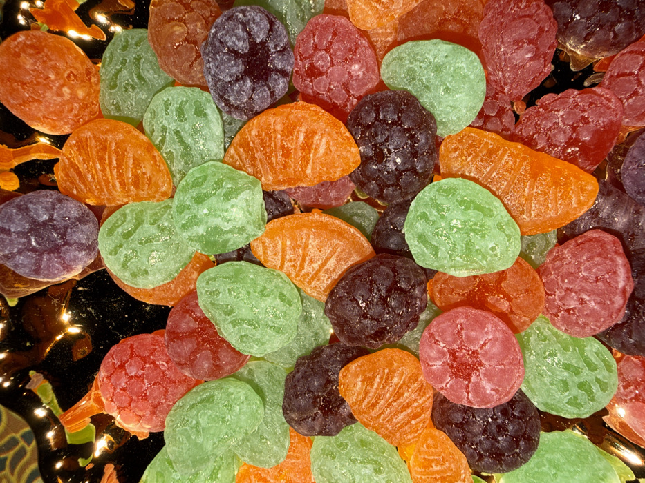 - "An assortment of old-fashioned hard candies, colored orange, green, red, and dark purple, fill the frame" by FM-7p9nD3, licensed under CC BY 4.0