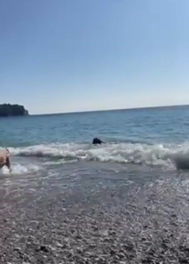 two dogs playing on a pebble beach. One dog is brown and white, and the other is dark grey. The dogs are running and splashing in the shallow water of a calm sea. In the distance, a small, green, rocky landmass can be seen. The sky is clear and blue.