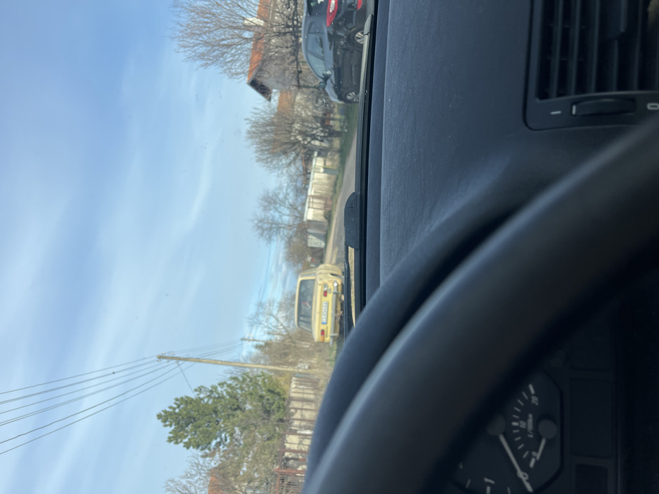 The image depicts a rural or suburban street scene in Opitsvet, Bulgaria, viewed from the interior of a vehicle. The foreground shows portions of a black steering wheel on the left and a black dashboard on the right, including a visible air vent and part of an instrument cluster displaying a "L/100km" gauge. Looking forward through the windshield, a narrow paved or unpaved road extends into the midground. A light yellow, older model sedan, identified by its rear as likely a Lada, is positioned centrally on the road, facing away from the viewer. Its Bulgarian license plate reads "B 2364 AK". To the right of the yellow sedan, a dark-colored (likely black) hatchback is parked, partially visible from its rear-right side. The environment features various residential structures on both sides of the road, including houses with reddish-brown tile roofs and light-colored facades. Property boundaries are marked by fences of varying construction, including stone or concrete, and wooden types. Vegetation includes numerous bare deciduous trees, indicating a cool season, alongside at least one prominent evergreen tree on the left. A wooden utility pole with multiple power lines runs along the left side of the road. The sky is clear to partly cloudy with a bright blue color.