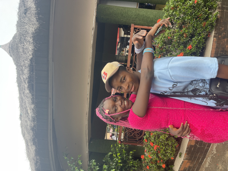 Two people are posing closely together. The person on the left is wearing a vibrant pink dress with polka dots and has their hair braided with pink accents. The person on the right has a tan baseball cap and a light blue shirt. They are hugging and smiling at the camera. They are outdoors in a setting with greenery and a building with a thatched roof. There are bracelets visible on the arm of the individual in the blue shirt.