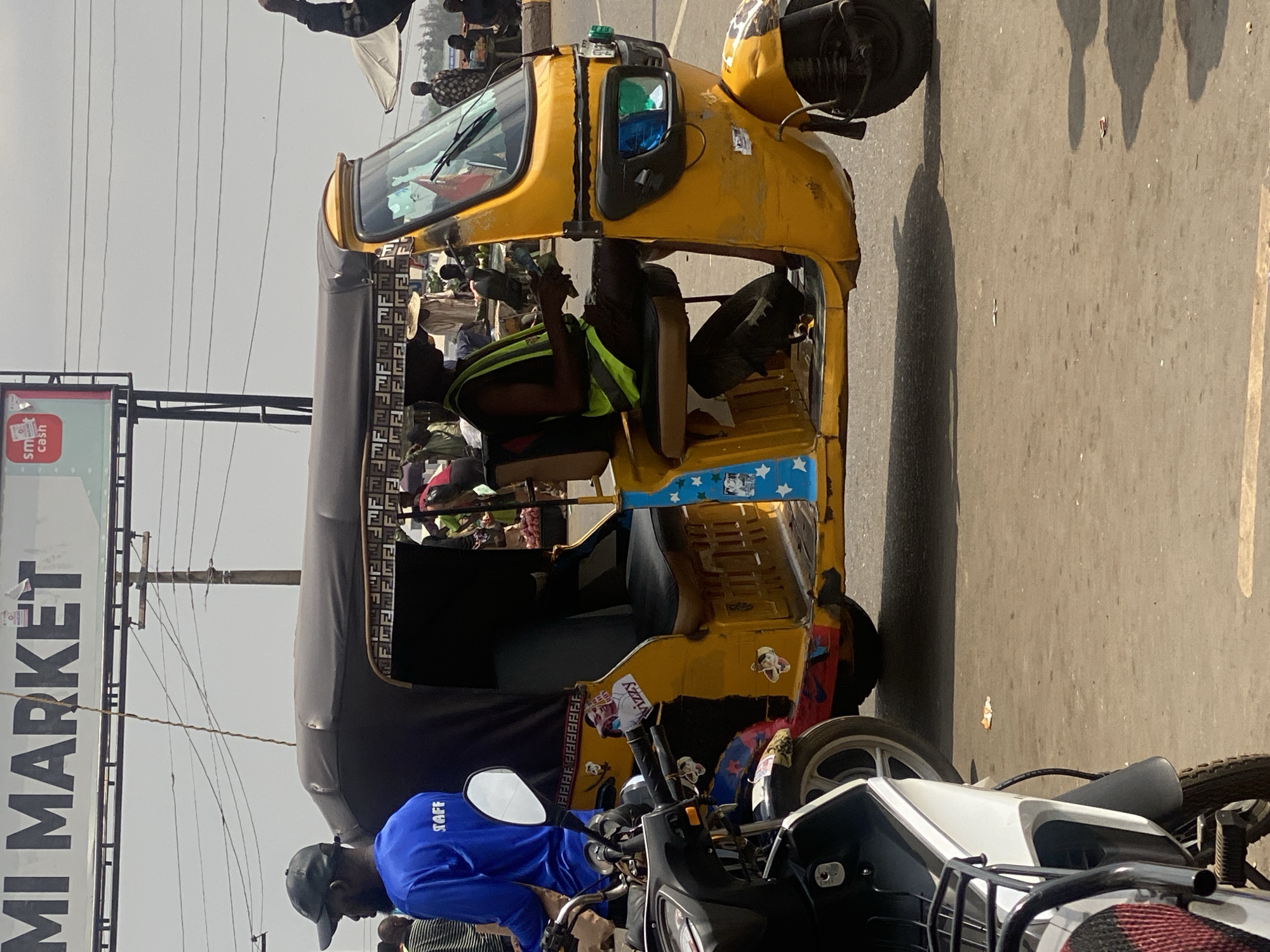 This image depicts a bustling street scene in Ibadan, Nigeria, specifically near a location identified by an overhead sign as "OMI MARKET." The central subject is a yellow, three-wheeled commercial tricycle, commonly known as a Keke Napep, positioned on an asphalt road. The tricycle has a black canvas roof trimmed with a repeating "Fendi" style pattern. The driver, a dark-skinned male, is seated inside, wearing a dark sleeveless shirt and a neon green reflective safety vest. He holds a stack of banknotes in his left hand. The tricycle's body is adorned with various stickers, including a stylized female face with "Wizzy" text, blue panels with white stars, and patches of red, blue, and leopard-print paint, indicating personalization and wear. To the immediate left and slightly forward of the tricycle, a dark-skinned male sits on a motorcycle, facing away from the viewer. He wears a black baseball cap and a royal blue long-sleeved shirt with the word "STAFF" printed in white on the back. Partially visible in the lower left foreground is the front section of a white and black motorcycle, featuring a black cargo rack and a red and black patterned seat cover. In the background, a busy market environment is evident, populated by numerous individuals, some appearing to be vendors. One person wears a distinctive straw hat. Market stalls and an umbrella are visible in the middle distance. Overhead, a large white billboard sign with "OMI MARKET" in black capital letters spans the upper frame, alongside a smaller "SM cash" sign. Utility wires crisscross the sky, connecting to a wooden utility pole. The sky is bright and appears overcast or hazy. The road surface is asphalt, showing minor debris and shadows cast by the vehicles.