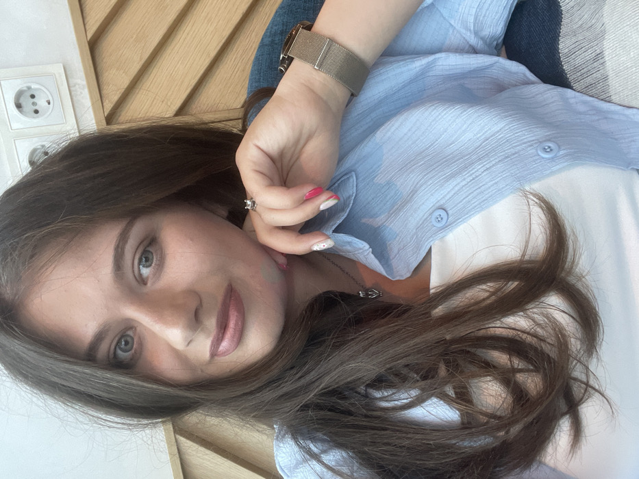An image depicts a close-up, eye-level indoor shot of a young adult female looking directly at the camera. The female subject has long, dark brown hair, light-colored eyes, and light skin tone. She is wearing a white top underneath a light blue, textured, long-sleeved button-up shirt, worn open. A silver-colored necklace with a small, elongated pendant is visible around her neck. Her left hand is raised, with the fingers lightly touching her jawline/chin area. This hand displays manicured nails, predominantly painted bright pink, with a white base and pink polka dots on the ring and pinky fingers. A silver-colored ring with a clear stone setting is present on her left ring finger. A watch with a metallic mesh band is worn on her left wrist. The background consists of a light-colored wooden slat panel to the right of the subject and a white wall with two visible electrical outlets (Schuko type) positioned in the upper right quadrant. A textured, dark blue fabric object is partially visible in the lower right corner, suggesting seating or a throw. The specific location within Pleven, Bulgaria, cannot be determined from the visual information provided, as the interior elements are generic to many modern establishments or residences.