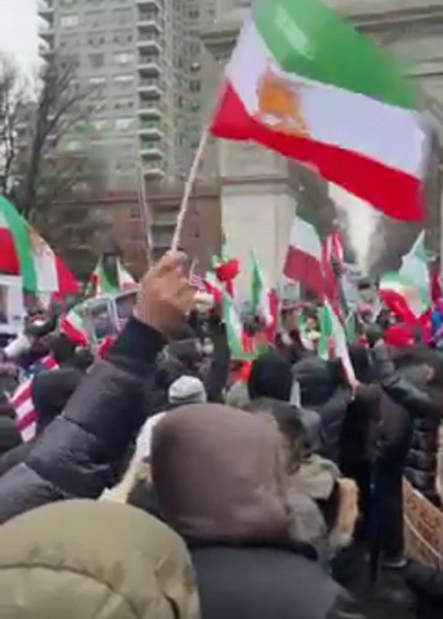A large group of people are protesting, waving Iranian flags and a few American flags. They are gathered in front of a large archway, possibly a monument, in a city. Most people are wearing winter clothing, suggesting it is cold outside. A few people are holding up signs. There is a tall building in the background. Some protestors are holding up pictures of people, possibly political figures. The crowd appears to be dense, with people packed closely together.