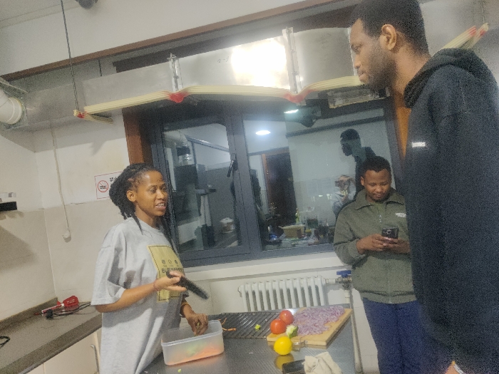 The image depicts an indoor kitchen or communal cooking area in the city of Unknown, Unknown