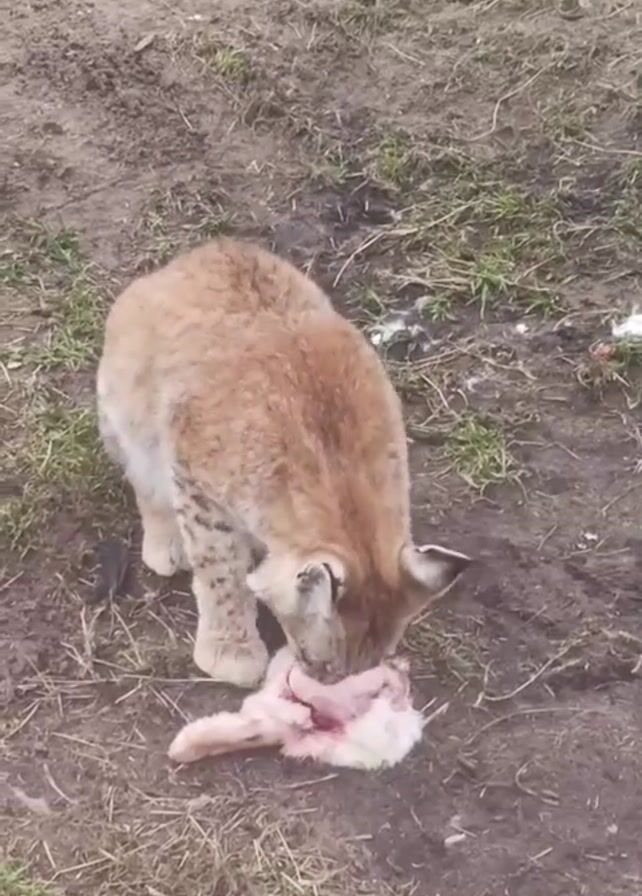 The video depicts a lynx, a wild cat species, feeding on what appears to be a rabbit carcass