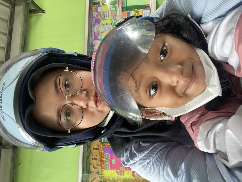 Two individuals, likely a mother and daughter, wearing motorcycle helmets are positioned close together. The mother is wearing glasses and a hijab-like head covering under her helmet. The daughter has a mask around her neck. Both are looking at the camera with gentle expressions. The background includes a green wall and a display of what appears to be packaged goods. The image is rotated slightly.