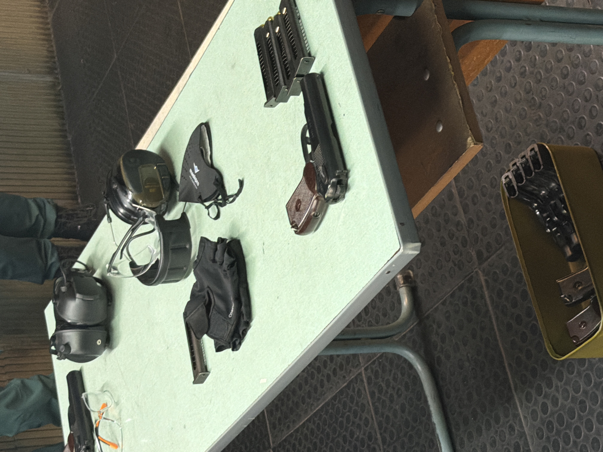 table with various objects on it, potentially in a shooting range. Items include: two pistols, one with a brown grip and the other black. There are also several magazines of ammunition, ear protection, eye protection, a face mask, and a pair of gloves. The location is assumed to be in or related to a gun range, with a tiled floor and metal chairs in the vicinity. There are 2 people wearing what appears to be green, however they are cropped by the image and it is unclear what their involvement is in the scene. Without additional context, no further information can be inferred about specific actions or interactions. No evidence in the image can confirm if the location is Pazardzhik, Bulgaria.