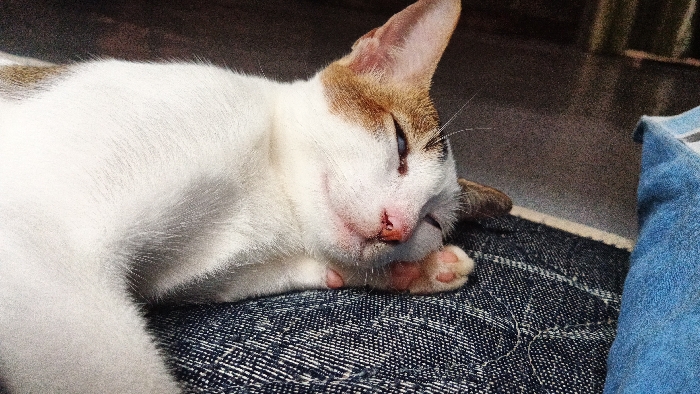 A white and brown cat rests on a dark blue denim surface. The cat's head is turned to the side, its eyes partially closed, and its paw tucked beneath its chin. The cat is mostly white with light brown patches on its head and ear. To the right of the denim is a lighter blue soft surface. The background appears to be a shaded area with indistinct features. The cat is the primary focus.