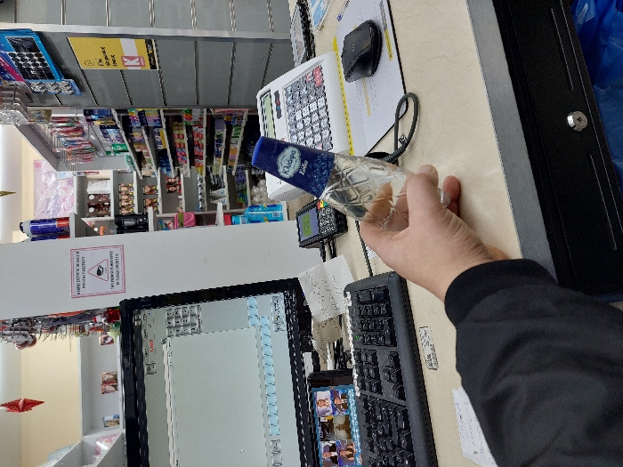 A human hand, covered by a black jacket with a ribbed cuff, is holding an empty or near-empty clear plastic bottle with a blue cap in the foreground. The bottle's label features the Greek text "ΚΛΙΜΑΡΑ Ζάλα" (Klimara Zala) and has a diamond-patterned texture. The scene depicts the interior of a retail store, specifically a counter area, located in Athens, Greece, as indicated by visible Greek text on signs and product labels. On the light-colored countertop, a dark computer monitor displays a point-of-sale (POS) interface with numerical data and, on a smaller inset, multiple video feeds of individuals. A black keyboard rests in front of the monitor, and a white sheet of paper with handwritten notes is visible nearby. To the right, a black payment terminal and a white electronic cash register with numerous buttons are present. A black computer mouse is positioned on a gray document. Beneath the counter, a black cash drawer with a silver lock mechanism is partially visible. In the background, white shelving units line the walls, stocked with various consumer goods including toiletries, personal care items, and packaged products. A white pillar separates sections of the shelves. Attached to this pillar is a red-bordered sign with a camera icon and Greek text stating, "ΑΥΤΟΣ Ο ΧΩΡΟΣ ΕΛΕΓΧΕΤΑΙ ΜΕ ΚΑΜΕΡΕΣ ΑΣΦΑΛΕΙΑΣ" (This property is monitored by security cameras). Further to the right, a gray corrugated panel is affixed with a yellow sign featuring the "ΚΛΕΙΔΑΡΙΑ K" (Klidaria K) logo, indicating a key or lock service. Red, star-shaped holiday decorations hang from the ceiling. The store is brightly lit.