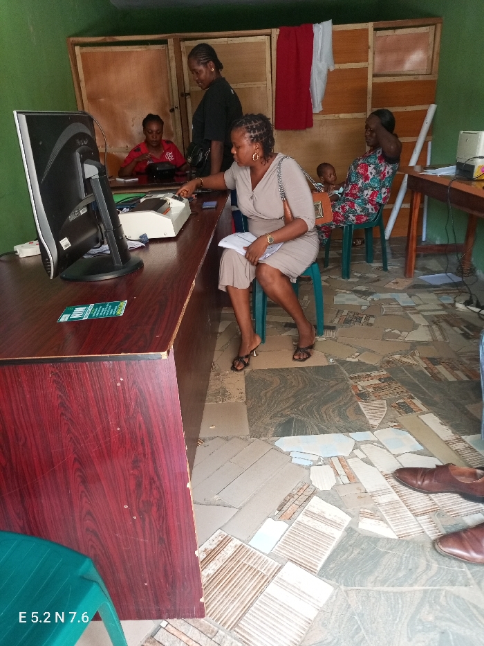 The scene is an interior space in a small business office in Ado Ekiti, Nigeria, located at coordinates 7