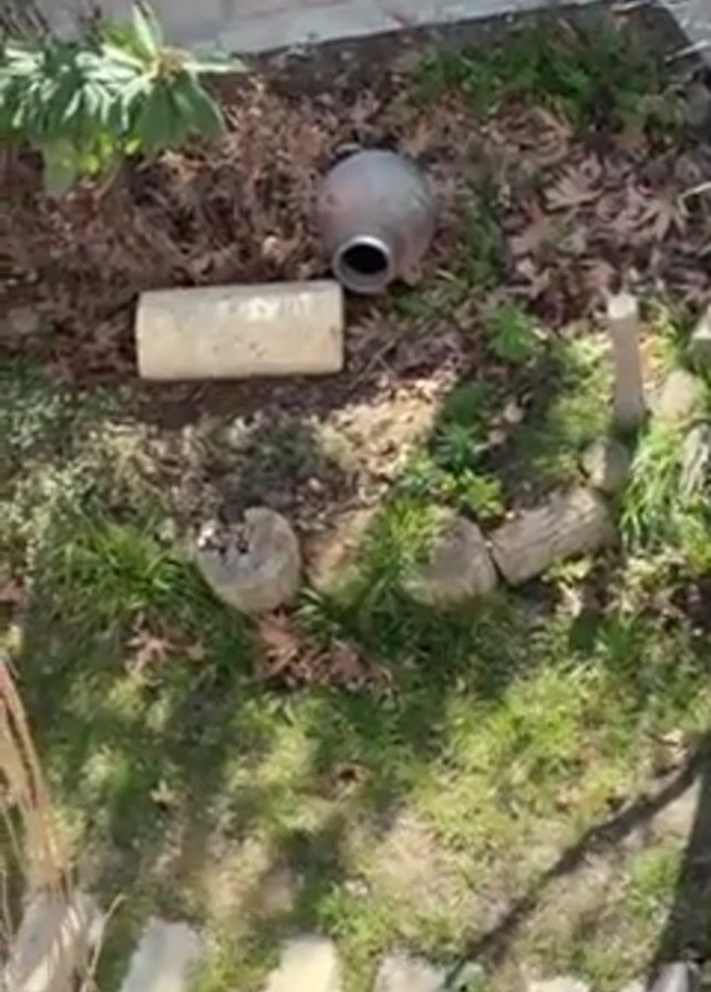 The camera pans up from an overhead shot of a small backyard garden with a stone walkway, to reveal the view from a high vantage point, possibly a balcony. The garden features a mix of grass, trees, and decorative elements such as a large clay pot, a concrete cylinder, and sections of tree trunks arranged in a semicircle. Adjacent to the garden is a building under construction. The overall setting suggests a residential area.
