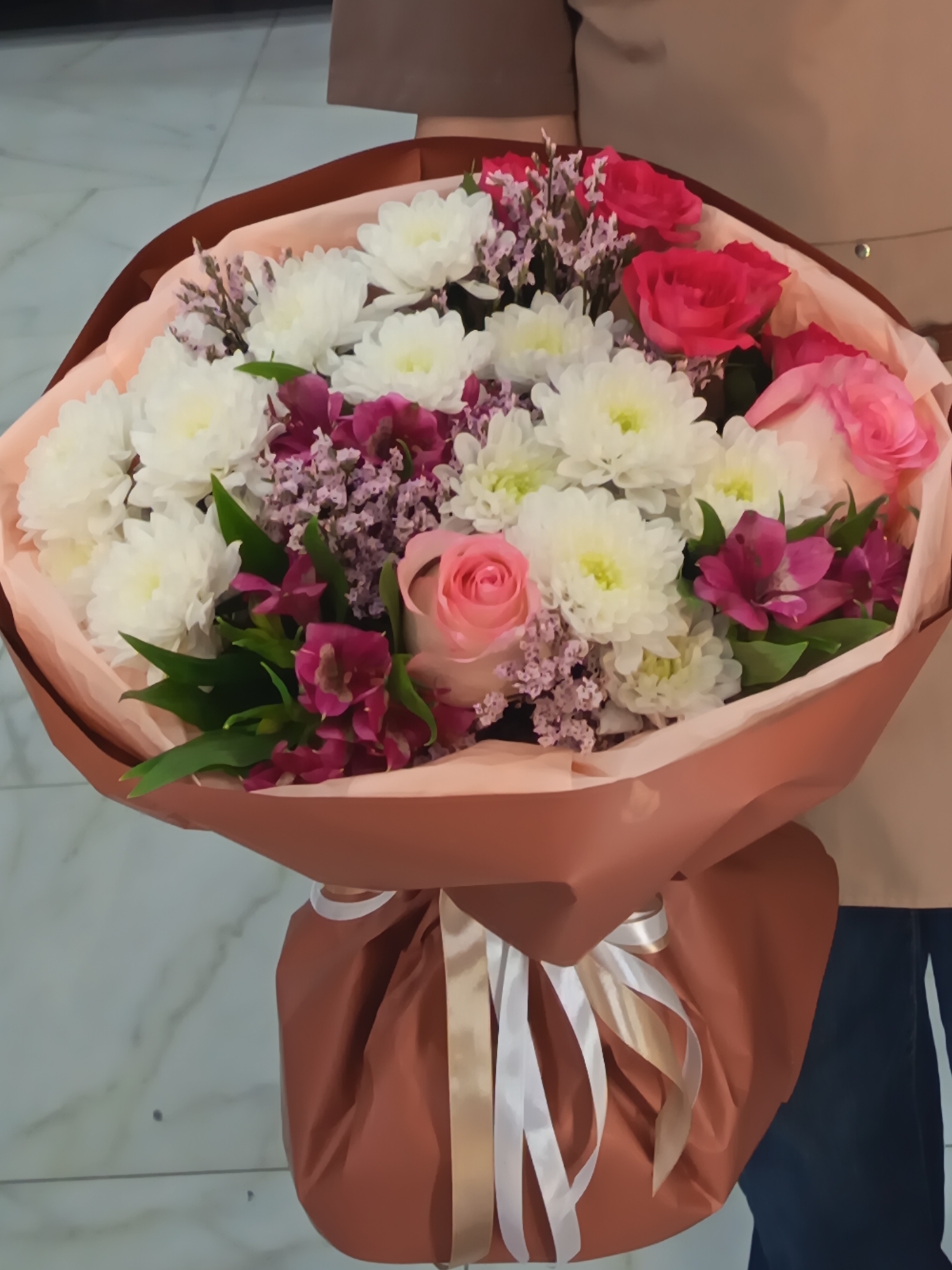 A person is holding a bouquet of flowers. The bouquet includes white chrysanthemums, pink and red roses, purple alstroemeria, and small purple filler flowers, wrapped in brown paper with a light peach-colored lining. The bouquet is tied with a mix of white and gold ribbons. The background is a blur, but appears to be a patterned surface, possibly tile or marble. The location is indicated as the city of Nizhnevartovsk, Russia.