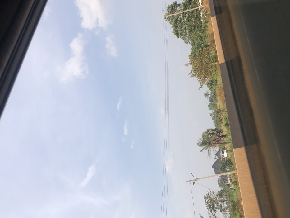 The image depicts a roadside scene in Nwofia, Nigeria, under a clear blue sky with scattered white clouds